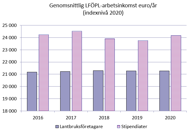 Utvecklingen av lantbruksföretagarnas och stipendiaternas LFÖPL-arbetsinkomst. Vid utgången av året var lantbruksföretagarnas genomsnittliga LFÖPL-arbetsinkomst 21 272 euro per år och stipendiaternas 24 160 euro per månad.