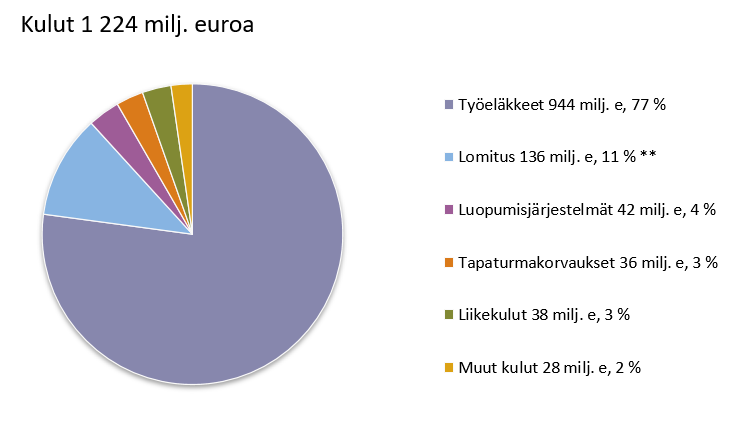 Kansaneläkelaitoksen maksuosuus oli 7,5 miljoonaa euroa. Lakiin perustuva Kansaneläkelaitoksen maksuosuus laski 27,6 %:sta 24,8 %:iin työajan MATA:n kokonaiskustannuksista vuoden 2020 alusta.
